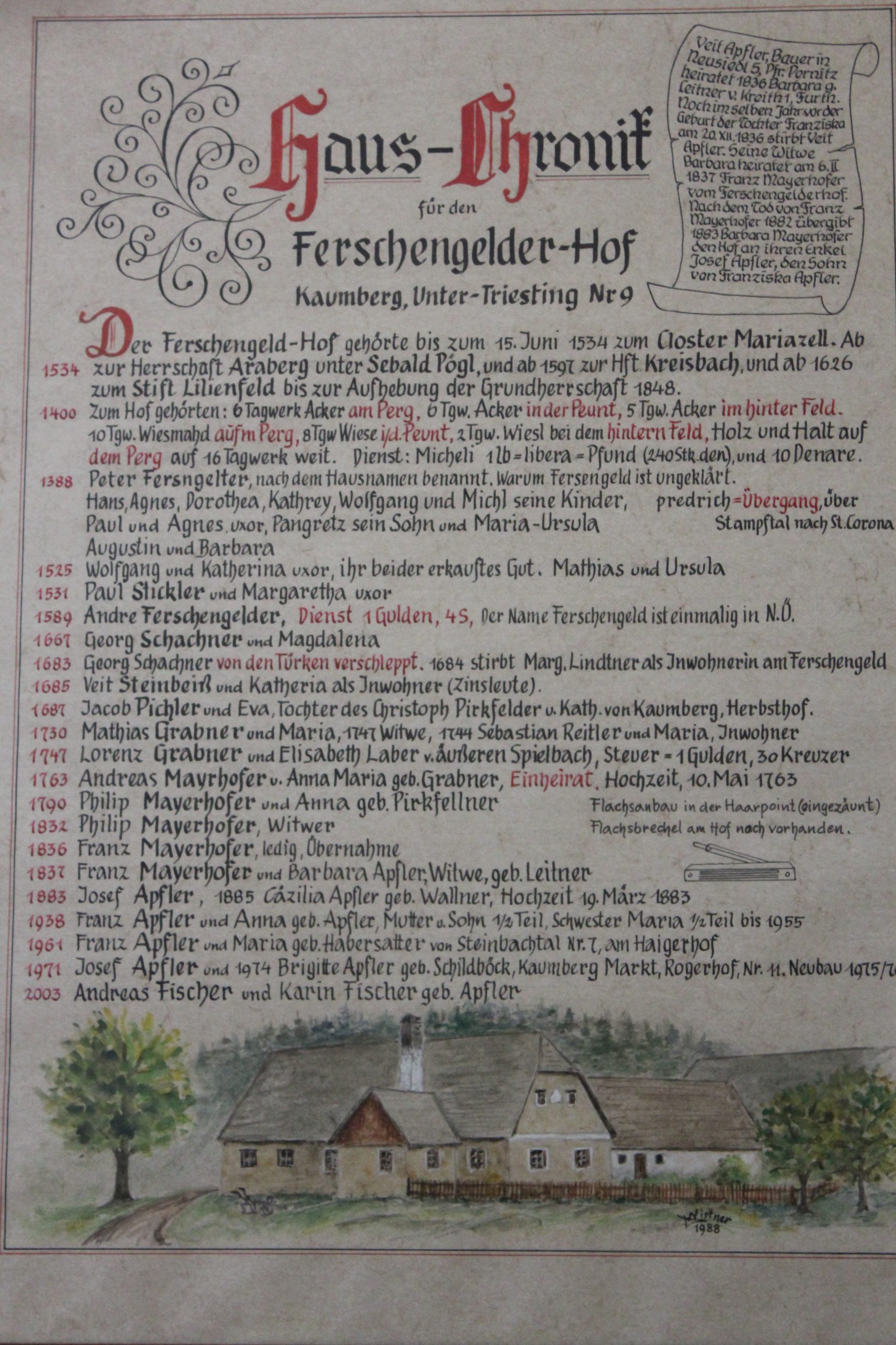 Unser mit Leidenschaft bewirtschafteter Biohof erlangte seinen Hofnamen „Fersengelder“ schon im Mittelalter. Bis ins 16. Jahrhundert (15. Juni 1534) war dieser noch im Besitz des Closters Mariazell (dem heutigen Klein-Mariazell im Wienerwald). Danach gehörte der Hof zur Herrschaft Araberg unter Sebald Pögl, ab 1597 zur Hft. Kreisbach und ab 1626 zum Stift Lilienfeld bis zur Aufhebung der Grundherrschaft im Jahr 1848, mehr dazu lesen Sie in unserer Hauschronik.